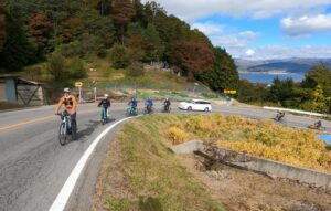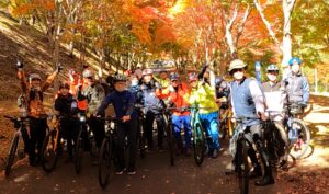 まずは諏訪湖サイクリングで自転車に慣れ、いざ有賀峠のヒルクライムへ‼みなさんe-バイクでぐんぐん登っていきました。ちょっぴり肌寒い季節でしたが、あっという間にアツアツに。今回のメインは「もみじ湖」の紅葉まつり。色が濃くとても見頃でした。塩嶺王城パークラインにある池には紅葉が湖面に写り絶景で、約55キロを完走した達成感を味わいました。