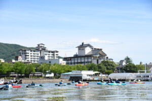 今回はe-バイクに乗るだけではなく、カヤック体験、岡谷の名物「うな重」を味わい、湖上のカフェで冷たい飲み物で一休みしながらの諏訪湖周を満喫する盛りだくさんのコースでした(^^)/